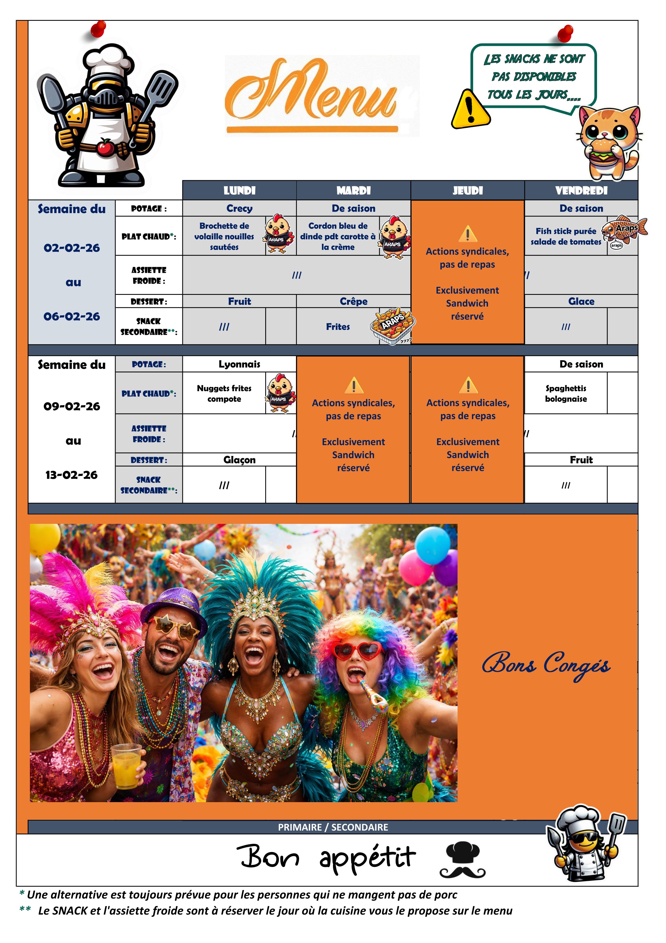 Repas complet € 4,00 Repas complet 1ére et 2éme primaire € 3,00 Sandwiches € 2,50 Crudités € 0.50 Potage € 0.50
